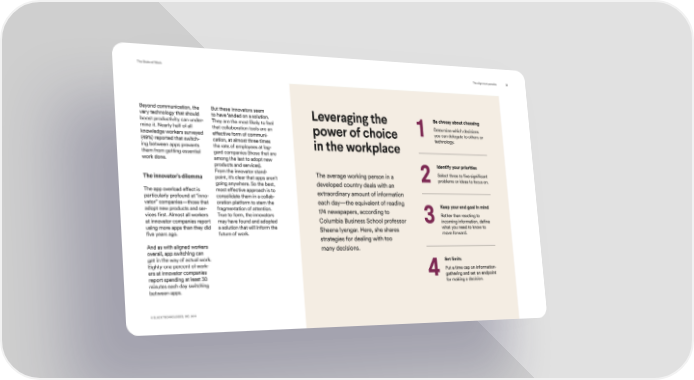 The State of Work The alignment paradox 32 Beyond communication, the But these innovators seem Be choosy about choosing very technology that should to have landed on a solution. Leveraging the boost productivity can under- They are the most likely to feel Determine which decisions mine it. Nearly half of all that collaboration tools are an power of choice 1 you can delegate to others or knowledge workers surveyed effective form of communi- technology. (49%) reported that switch- cation, at almost three times ing between apps prevents the rate of employees at lag- in the workplace them from getting essential gard companies (those that are work done. among the last to adopt new Identify your priorities products and services). From the innovator stand- The average working person in a Select three to five significant The innovator’s dilemma point, it’s clear that apps aren’t 2 problems or ideas to focus on. going anywhere. So the best, developed country deals with an The app overload effect is most effective approach is to extraordinary amount of information particularly profound at “inno- consolidate them in a collab- vator” companies—those that oration platform to stem the each day—the equivalent of reading Keep your end goal in mind adopt new products and ser- fragmentation of attention. 174 newspapers, according to vices first. Almost all workers True to form, the innovators Rather than reacting to at innovator companies report may have found and adopted Columbia Business School professor 3 incoming information, define using more apps than they did a solution that will inform the Sheena Iyengar. Here, she shares what you need to know to five years ago. future of work. strategies for dealing with too move forward. And as with aligned workers many decisions. overall, app switching can get in the way of actual work. Set limits Eighty-one percent of work- ers at innovator companies Put a time cap on information- report spending at least 30 4gathering and set an endpoint minutes each day switching for making a decision. between apps. © SLACK TECHNOLOGIES, INC. 2019