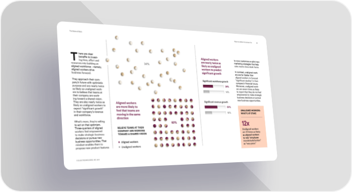 The State of Work Alignment affects the bottom line 20 here are clear Aligned workers to wow customers or pilot new benefits to invest- are nearly twice as marketing strategies that help Ting time, effort and 34% likely as unaligned sales teams close deals faster. resources into building an workers to predict aligned workforce—namely, significant growth In contrast, unaligned work- aligned workers drive ers are far likelier than business forward. aligned workers to forecast Significant workforce growth “significant decline” in their They approach their com- company’s financial future. pany’s future with optimistic 24% Moreover, unaligned work- purpose and are nearly twice ers are seven times as likely as likely as unaligned work- 14% to report that they do not feel ers to believe that teams at empowered to make strategic their company are work- business decisions or pursue ing toward a shared vision. Significant revenue growth new business opportunities. They are also nearly twice as Aligned workers likely as unaligned workers to are more likely to 30% expect “significant growth” feel that teams are UNALIGNED WORKERS: in their company’s revenue moving in the same 16% WHAT’S AT STAKE and workforce. direction What’s more, they’re willing 60% to act on that optimism. 12x Three-quarters of aligned BELIEVE TEAMS AT THEIR workers feel empowered COMPANY ARE WORKING Unaligned workers to make strategic business TOWARD A SHARED VISION are 12 times as likely decisions or pursue new as aligned workers business opportunities. That Aligned workers to rate “employee mindset enables them to morale/satisfaction” propose new product features Unaligned workers as “very poor.” © SLACK TECHNOLOGIES, INC. 2019