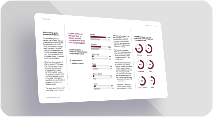 The State of Work Getting to alignment 25 Share strategy goals Aligned workers are Monthly from sharing its strategy annu- UNDERSTANDING OF STRATEGIC quarterly at minimum the most likely to 47% ally to monthly to reap the GOALS IN RELATION TO FREQUENCY receive monthly 29% benefits. Even incremental OF COMMUNICATION Communicating with col- communication about increases in communication leagues may be a key element their company’s goals frequency can improve knowl- of alignment, but ensuring that Quarterly edge workers’ understanding knowledge workers under- 30% of company strategy. stand the company’s strategic 76% 71% goals is equally, if not more, HOW FREQUENTLY A 24% For instance, a subtle shift important. To understand the COMPANY COMMUNICATES from communicating strategic strategy, knowledge workers ITS STRATEGIC GOALS Twice a year goals annually to twice a year Monthly Quarterly need to know what it is. That 5% boosts understanding of the knowledge comes through fre- company strategy by 9 per- quent communication. 5% centage points. Aligned workers More than three-quarters of Unaligned workers And there are other benefits aligned workers (77%) report Yearly to communicating strategy 68% 59% that their company commu- 11% monthly: Workers who receive nicates its strategic goals 16% monthly strategy updates at least quarterly. Nearly are the most likely to say that half (47%) say their compa- their company is open to Twice a year Yearly ny’s goals are shared at least Every 2–3 years new ideas. The same can be monthly. Unaligned workers, 3% said about employees who on the other hand, are the 7% feel that teams at their orga- most likely to report that their nization are working toward company never shares its a shared vision. 59% 46% strategic goals. Never 5% There’s also a direct cor- The good news is that a com- relation between monthly pany doesn’t need to jump 18% communication of strategy Every 2–3 years Never © SLACK TECHNOLOGIES, INC. 2019