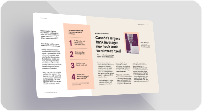 The State of Work The alignment paradox 3131 TOP MANAGEMENT AND communication challeng- CULTURE CHALLENGES ALIGNMENT IN ACTION ing. The same can be said of GLOBALLY those who work with different people and teams every day— Canada’s largest 63% of them feel the strain. Martin Wildberger, Collaborating with bank leverages Executive Vice people across President, Innovation Knowledge workers need 1 several time zones and Technology, RBC better (not more) software new tech tools Adding more software and to reinvent itself communication tools isn’t the Using more than answer—workers need better six apps per day When used well, technology solutions. Knowledge work- 2 is a key driver of innovation ers often find their attention divided across multiple ave- nues, and the proliferation of workplace software that Receiving more Reinvention is not just the transforming itself into data, which we are able to (mostly) enhances productivity than 25 emails daily domain of startups. Disruption a digital-first institution, connect and analyze through can also contribute to frag- 3 in this new era of work is according to the company’s new techniques like AI,” mentation of attention. something even the largest executive vice president of Wildberger says. “As a result, and most successful enter- innovation and technology, we will soon only be limited by More than half of knowledge prises are tackling head-on. Martin Wildberger. our own imaginations. These workers who use more than Working with And leaning into new technol- advancements are allowing us six apps on a daily basis find different people and ogies is a major part of that “One of the most exciting to not only derive better solu- cross-functional communica- 4teams every day* transformation. things on the innovation front tions to problems we’ve been tion challenging. The same is we’re approaching an age wrestling with for ages, but applies to those who receive The Royal Bank of Canada, where we have access to tre- more importantly to do things more than 25 daily emails. *For each condition, more than half of respondents found a 150-year-old bank and mendous compute capacity that we’ve never done before.” it challenging to “communicate with coworkers in different teams, departments or offices.” the largest in Canada, is alongside an abundance of © SLACK TECHNOLOGIES, INC. 2019
