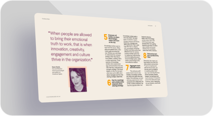The State of Work Looking ahead 35 “When people are allowed Empower all Knowledge workers seek a fragment attention. leaders to share “two-way street” that facil- Nearly half of knowledge 5the strategic itates an inclusive, organic workers today report that to bring their emotional vision, but start dialogue between and among switching between apps at the top executives, managers and prevents them from getting office personnel. Team meet- essential work done. So select truth to work, that is when Knowledge workers want to ings offer this to a degree, apps carefully and source hear from the source. When and, accordingly, knowledge solutions that consolidate, innovation, creativity, plans are passed down, infor- workers rank them as the most rather than divide, attention. mation gets lost along the effective forum for commu- way. Workers are most likely nicating strategic goals. But Distraction isn’t engagement and culture to understand the company for deepening understanding just a productivity strategy when they hear it and encouraging discussion 8killer from leaders, whether CEOs around strategic goals, collab- thrive in the organization.” or other executives. Three- oration tools emerge as the Distraction also means you quarters of knowledge most effective medium. leave behind your best pos- workers who receive strat- sible problem-solving brain. Susan David, egy communications from the Aggregate tools “If you’re not giving your- Harvard Medical CEO feel they understand the and information self the time to focus, you School psychologist company strategy. This drops 7 are less good at engaging and author of slightly, to 74%, for the exec- The software prolif- in creative problem-solv- Emotional Agility utive team and to 68% when eration trend is here to stay. ing,” says Columbia Business direct managers are the ones Globally, knowledge workers School professor Sheena sharing strategic objectives. are using more apps than ever Iyengar. And perhaps even before. And while apps can (and more seriously, it’s long been Opt for meetings do) help people become more proven that distraction leads and collaborative productive and collaborative, all to errors, which, depending 6channels when of this “context switching” can on your industry, could have sharing strategy have the opposite effect and steep costs. © SLACK TECHNOLOGIES, INC. 2019