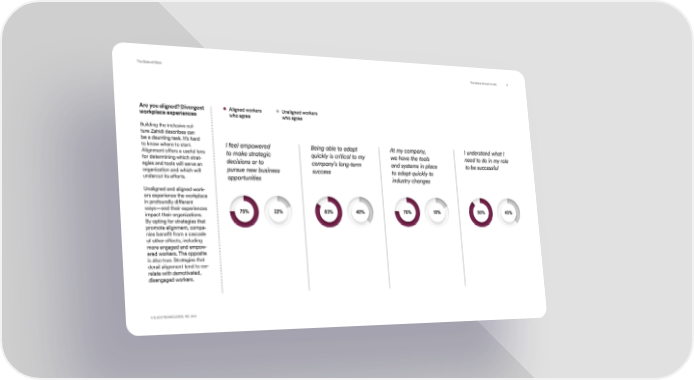 The State of Work The future of work is now 11 Are you aligned? Divergent Aligned workers Unaligned workers workplace experiences who agree who agree Building the inclusive cul- ture Zahidi describes can be a daunting task. It’s hard I feel empowered Being able to adapt At my company, I understand what I to know where to start. Alignment offers a useful lens to make strategic quickly is critical to my we have the tools need to do in my role for determining which strat- decisions or to company’s long-term and systems in place to be successful egies and tools will serve an pursue new business success to adapt quickly to organization and which will undercut its efforts. opportunities industry changes Unaligned and aligned work- ers experience the workplace in profoundly different ways—and their experiences 75% 22% 83% 40% 76% 19% 90% 43% impact their organizations. By opting for strategies that promote alignment, compa- nies benefit from a cascade of other effects, including more engaged and empow- ered workers. The opposite is also true. Strategies that derail alignment tend to cor- relate with demotivated, disengaged workers. © SLACK TECHNOLOGIES, INC. 2019